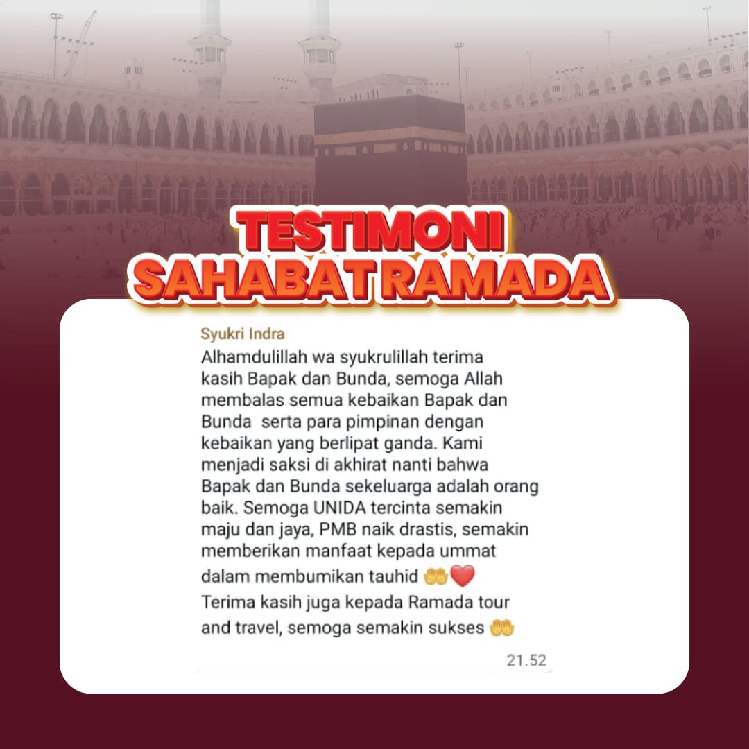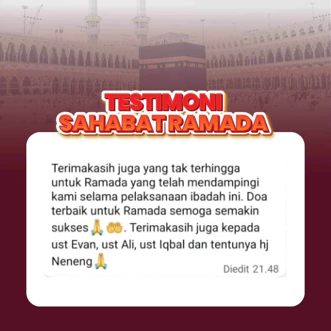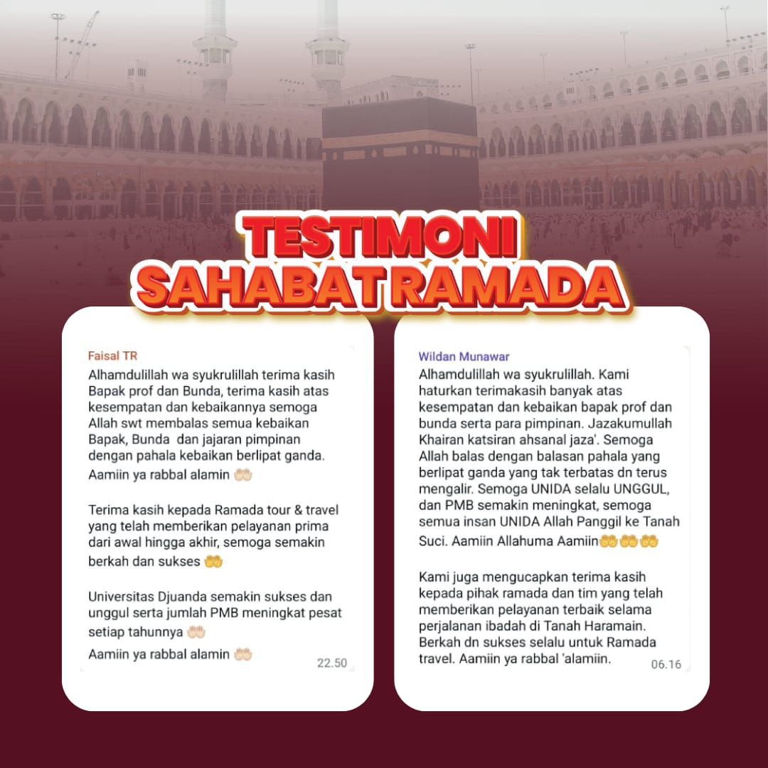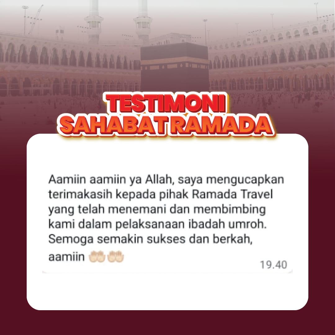 RAMADA TOUR dibangun bukan dalam rangka coba-coba. RAMADA dibangun dengan dedikasi tinggi oleh para pendirinya yang sudah lebih dari 20 tahun berkecimpung dalam industri Tour dan Travel. Ingin menjadikan Travel Umroh - Haji pilihan Masyarakat Indonesia yang terpercaya, Inovatif, edukatif serta berorientasi pada kepuasaan pelanggan.